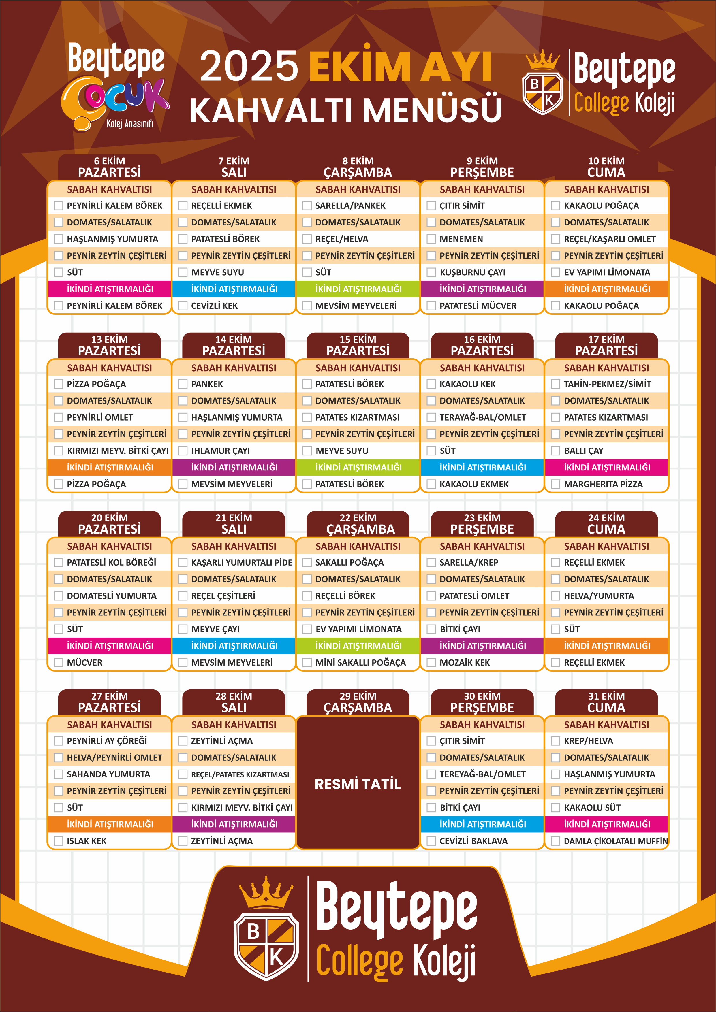 2025 Ekim Ayı Kahvaltı Menüsü