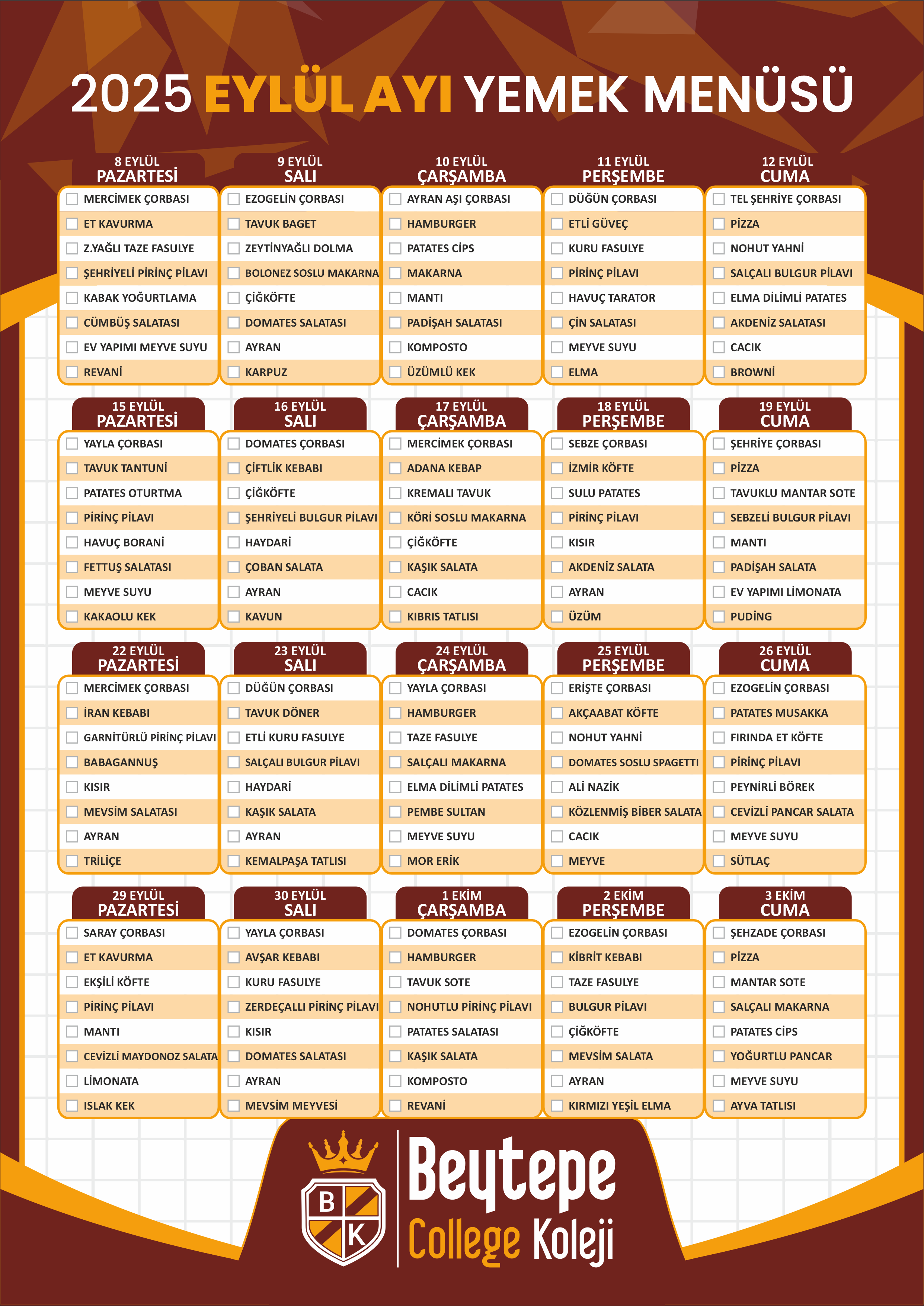 2025 Eylül Ayı Yemek Menüsü
