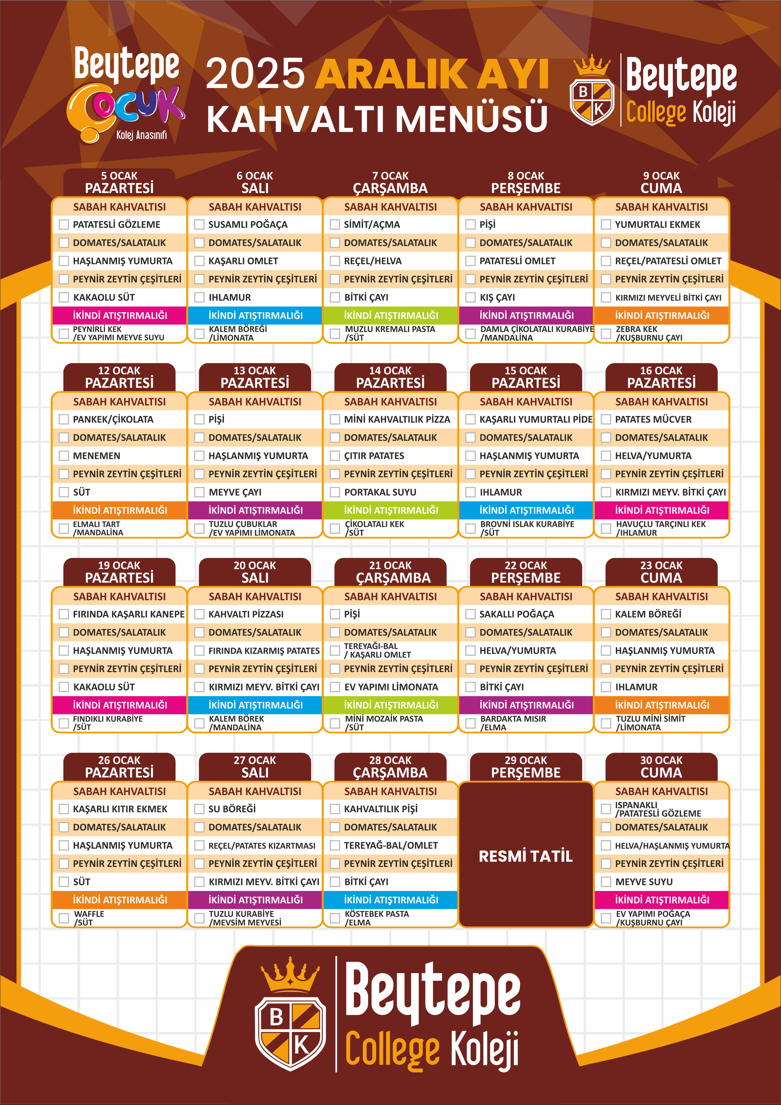 2026 Ocak Ayı Kahvaltı Menüsü