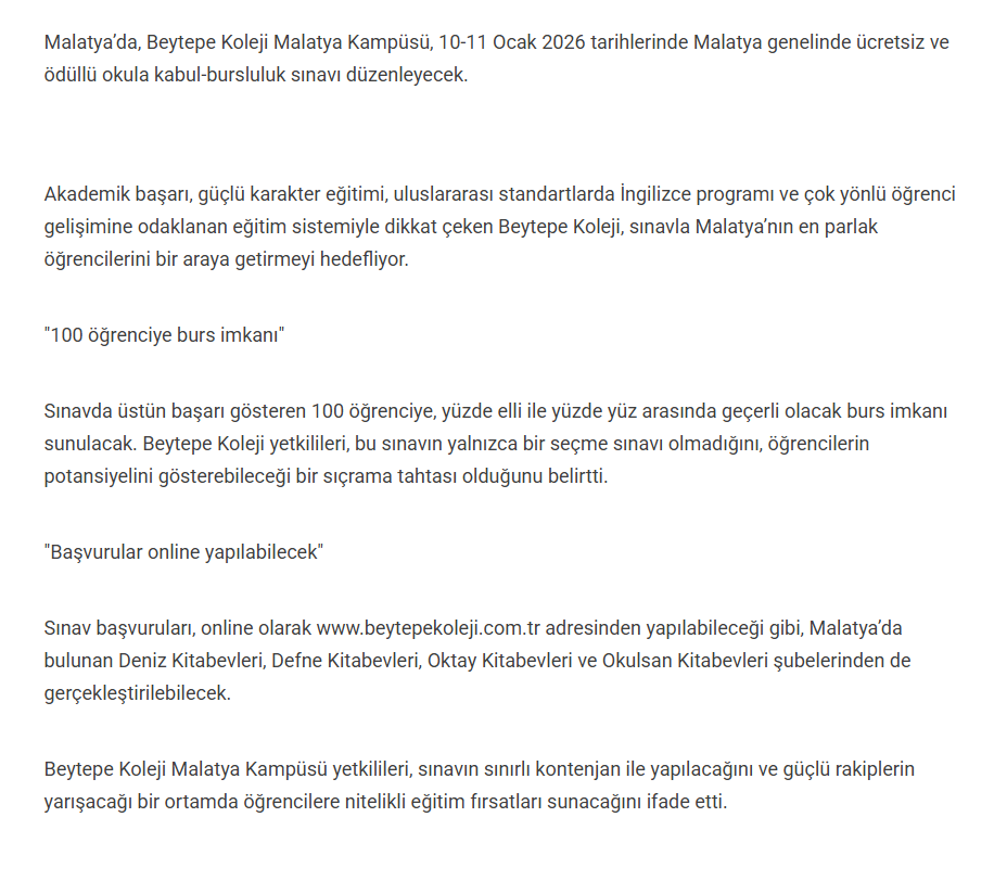 Malatya’da, Beytepe Koleji Malatya Kampüsü, 10-11 Ocak 2026 tarihlerinde Malatya genelinde ücretsiz ve ödüllü okula kabul-bursluluk sınavı düzenleyecek.