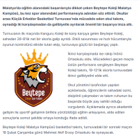 Okullar arası Küçük Erkekler Basketbol Turnuvası'nda mücadele eden Beytepe Koleji Malatya Kampüsü takımı, Kanguru Koleji'ni 26–8, İnönü Ortaokulu'nu ise 19–12 mağlup ederek turnuvaya güçlü bir başlangıç yaptı.